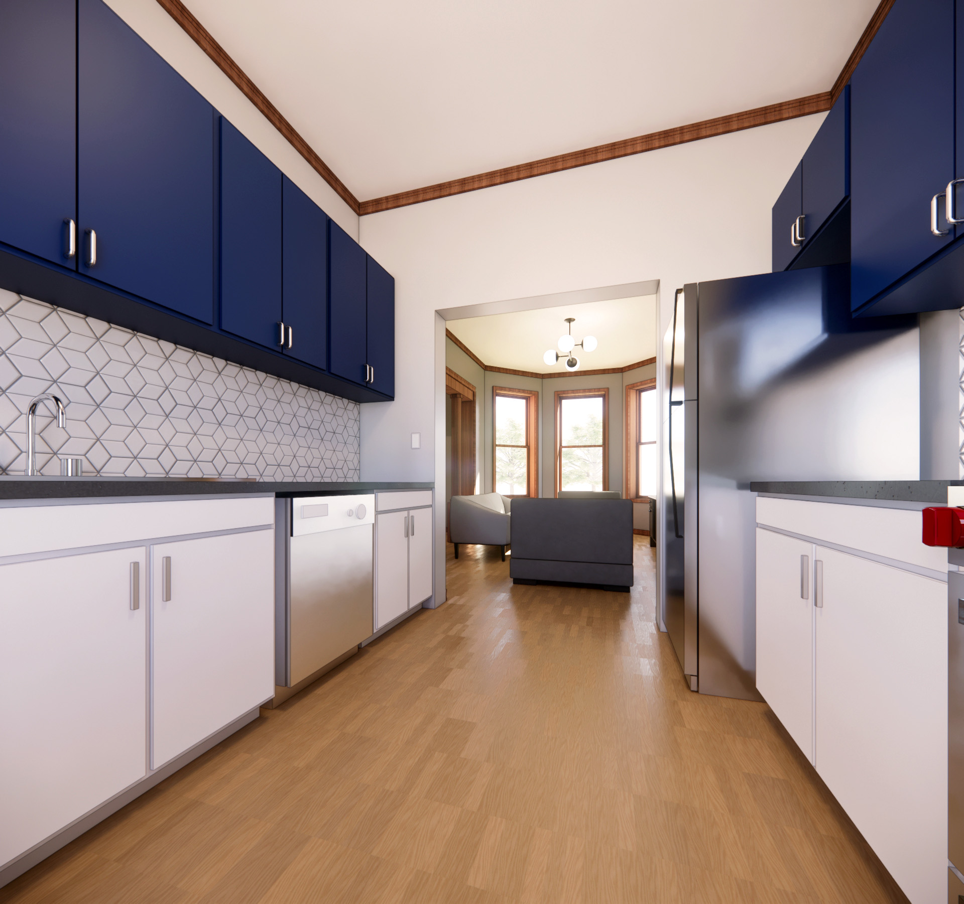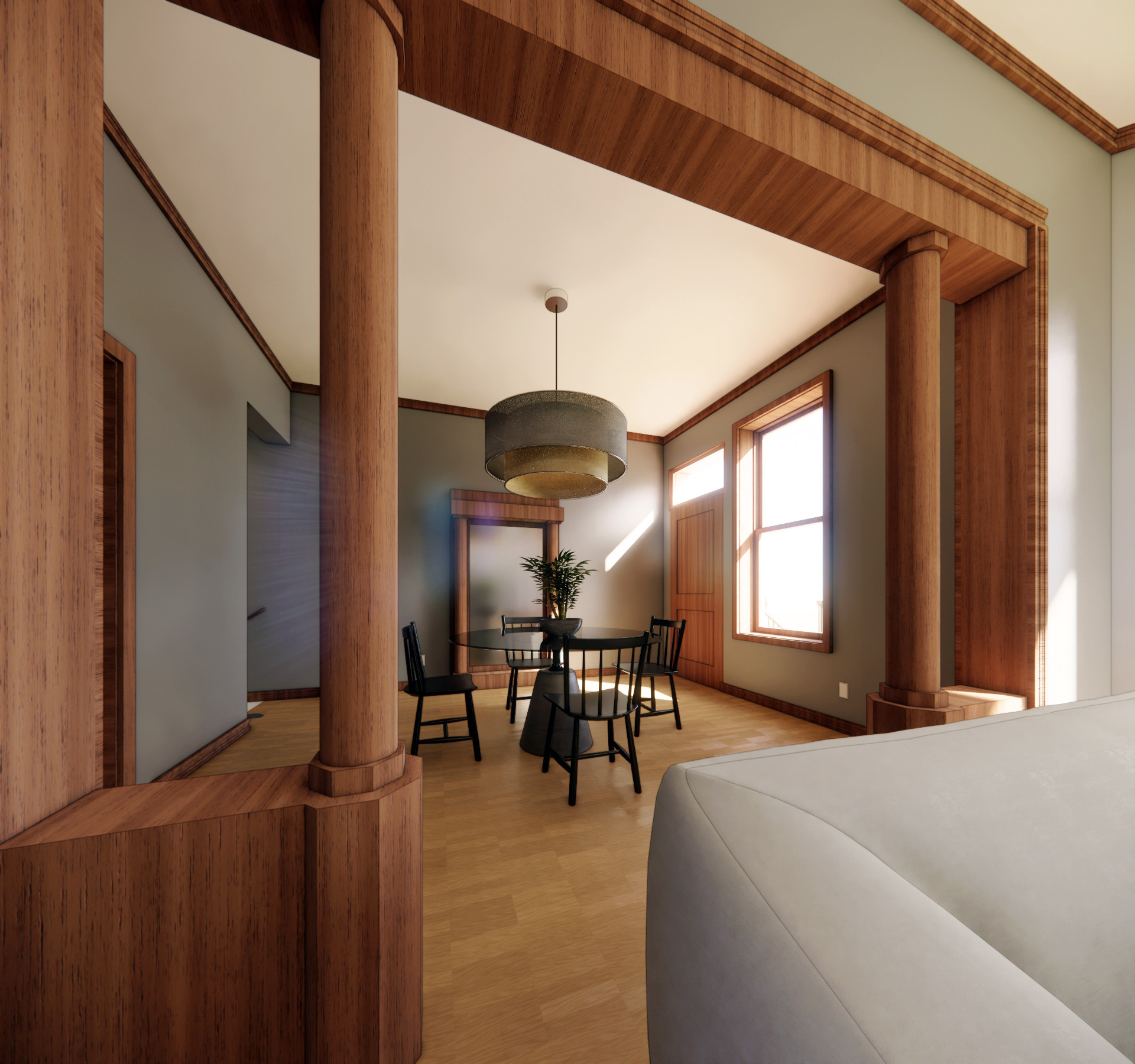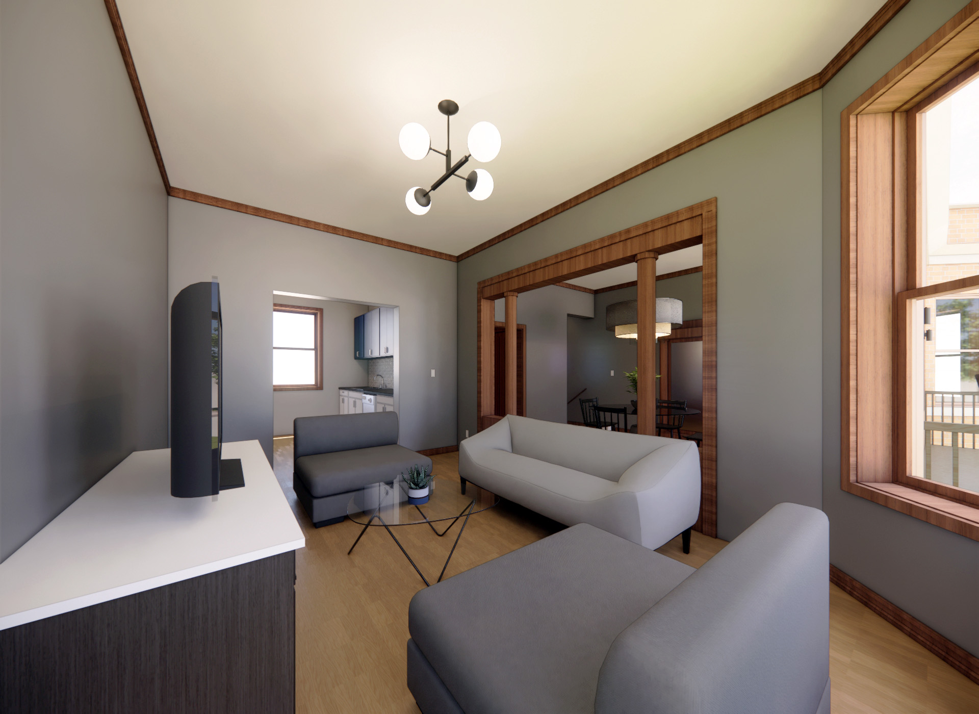 A coach house with a storied history from the 1880s, vacant for years but with good bones, gets a revitalized life as two affordable duplex condo units in our upcoming renovation with Here to Stay Community Land Trust. On the same property as the first condos under a Community Land Trust in Illinois, the gut renovation will add two additional three-bedroom, one-and-three-quarter-bath duplex condo units for affordable homeownership. Taking advantage of the garden-unit-esque basement level, we created a private lower level with bedrooms, laundry, mechanicals, and bathrooms. This allows the upper level, with its existing built-in millwork and historic trim, to maintain its character, being updated with new kitchens, living rooms, and dining areas. Doing so allows the coach house to serve as housing for families once again.