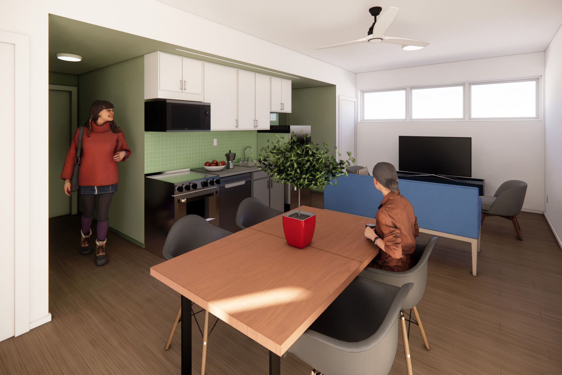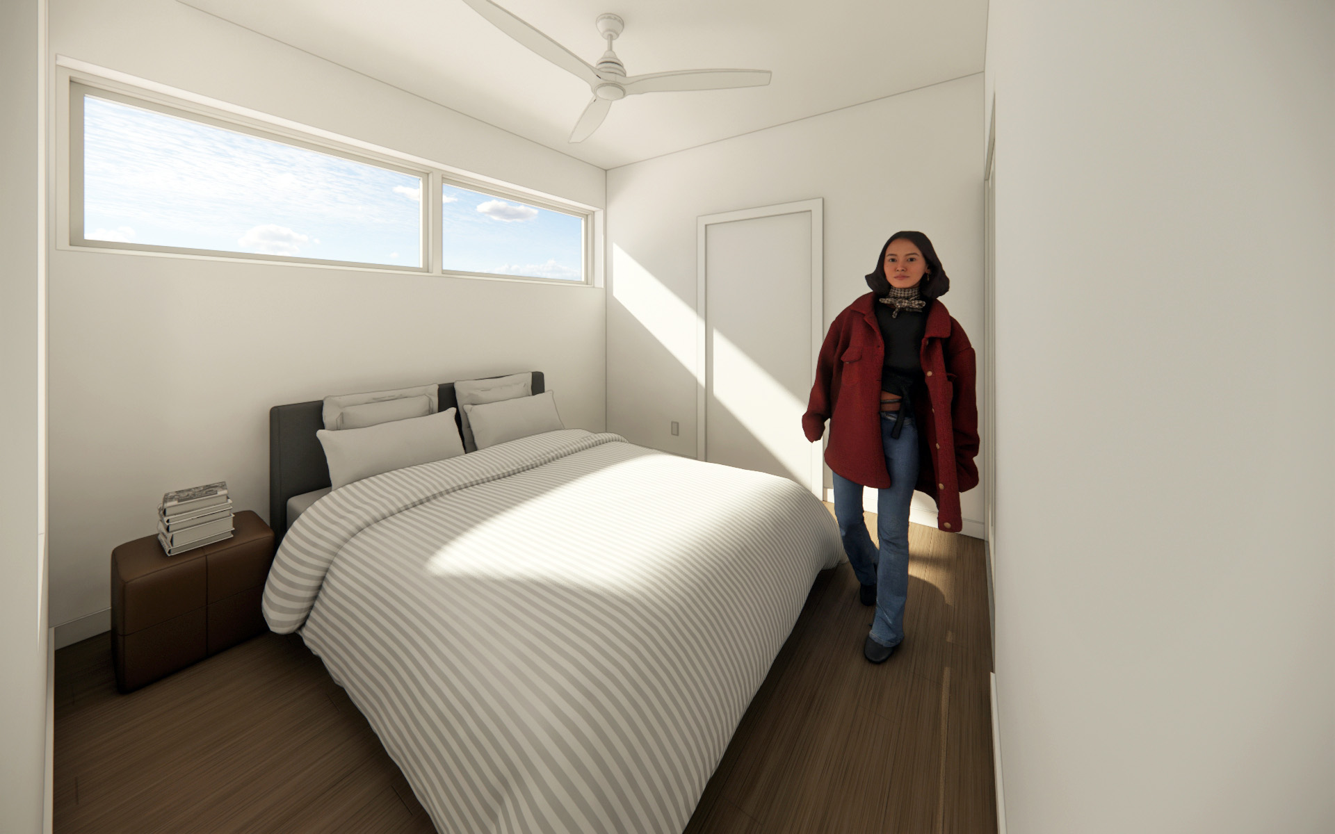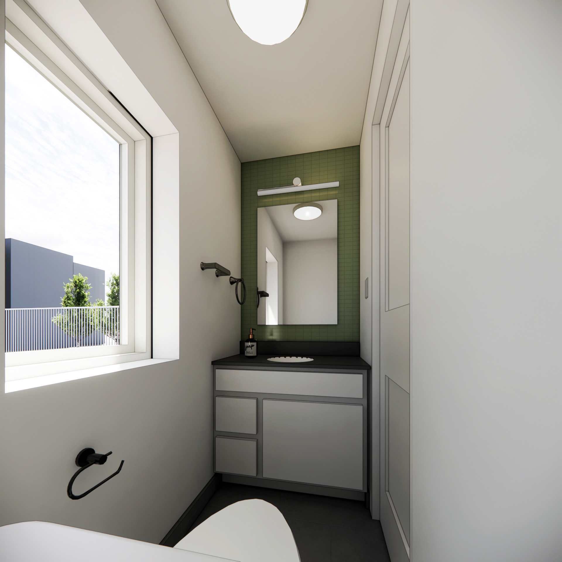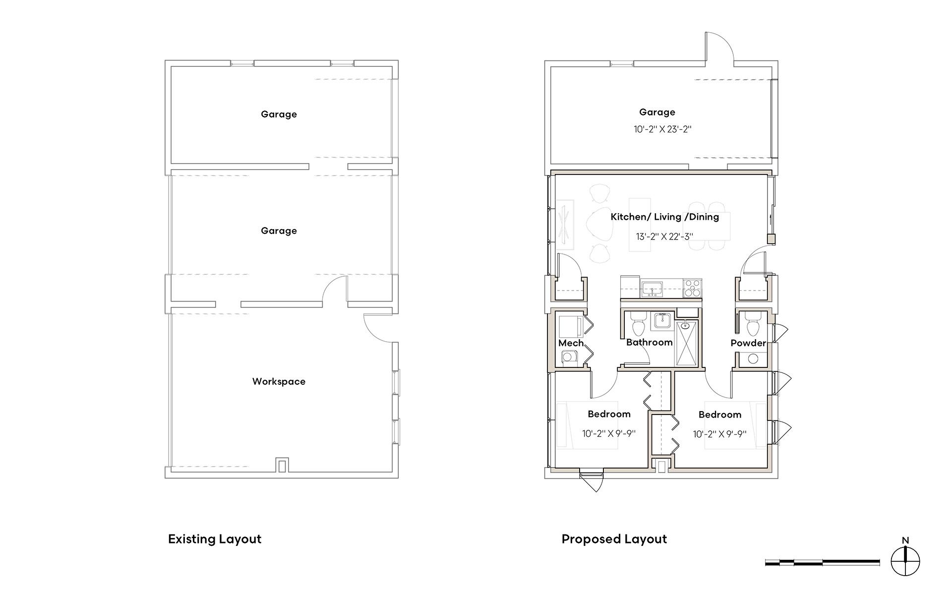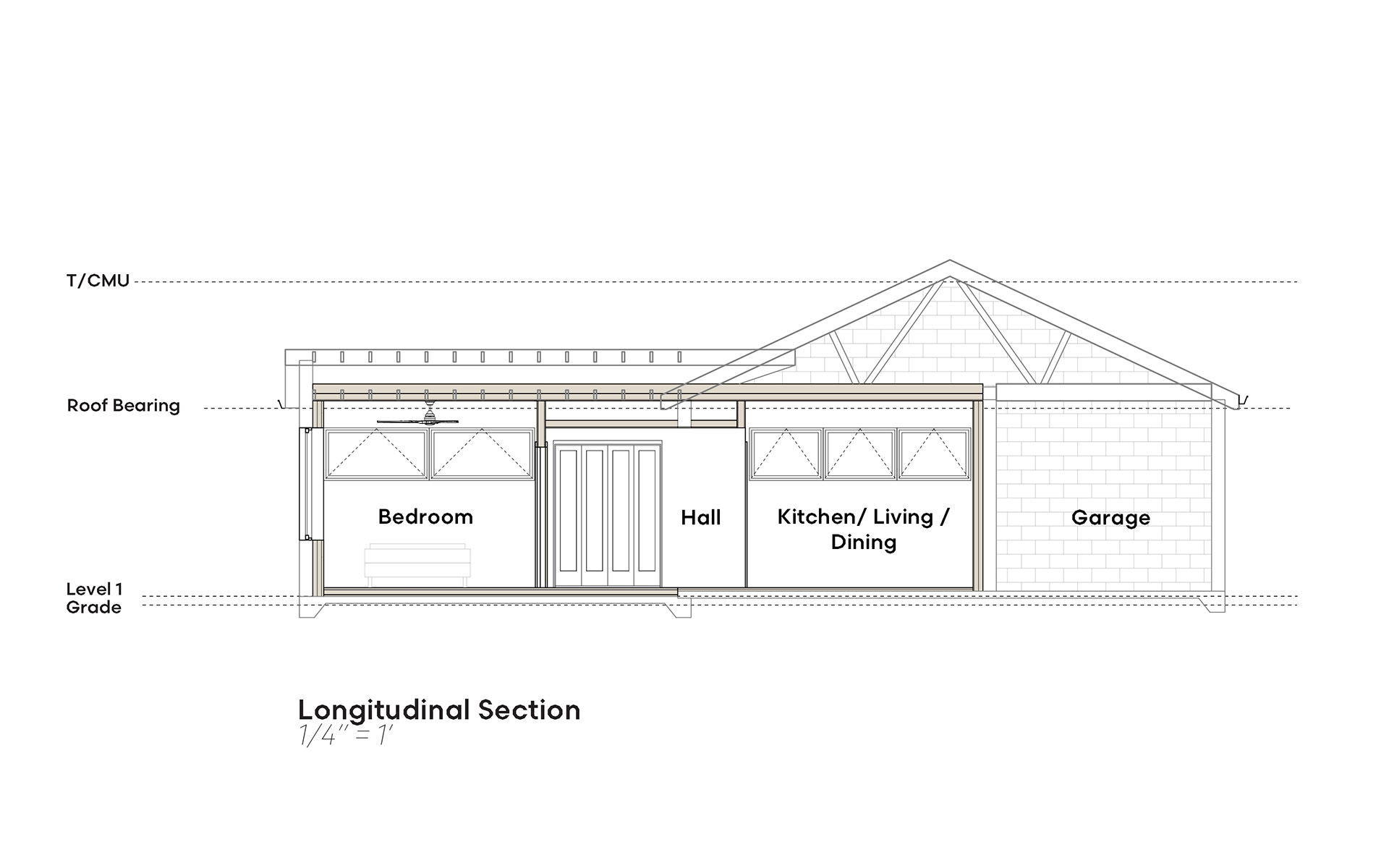 An existing garage gets a new life as a two-bedroom, one-and-a-half bathroom ADU Adaptive Reuse in Evanston, replacing parking with much-needed housing. Our client approached us with a desire to turn their existing garage, built by a past owner but not required for parking by the client, into new housing for family or potential rental. Utilizing the existing garage’s structure, we crafted a tripartite approach: creating an insulated box within the garage to house the ADU, opening new openings from the existing garage doors, and separating the program into bands. The Living/Dining/Kitchen area receives natural light from new openings at the former garage doors, serviced by a band containing storage, kitchen equipment, mechanical/utilities, and both the main bathroom and powder room. This service band separates living spaces from the bedrooms, allowing for privacy. Natural light and air fill the new ADU, reclaiming parking spaces for housing.