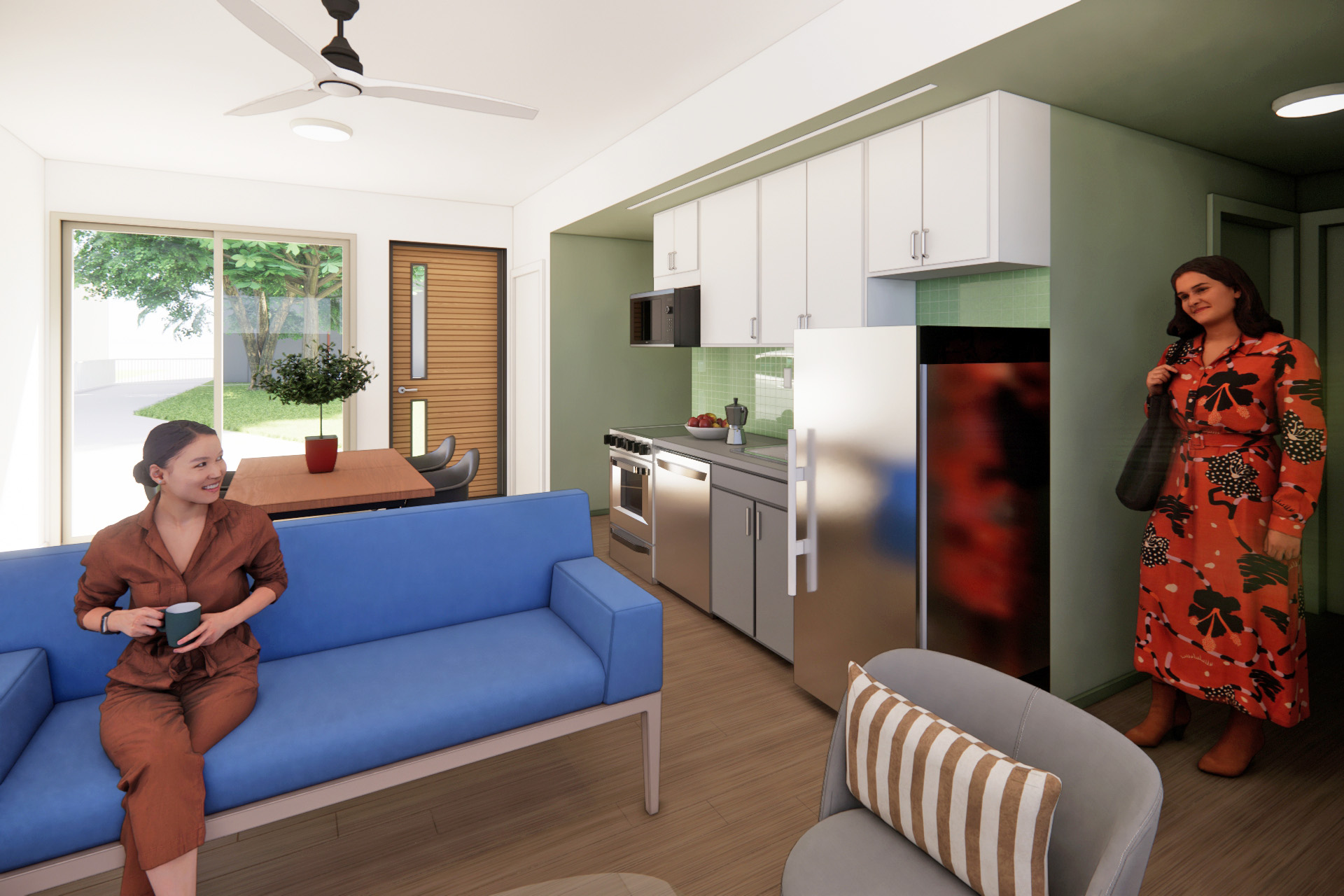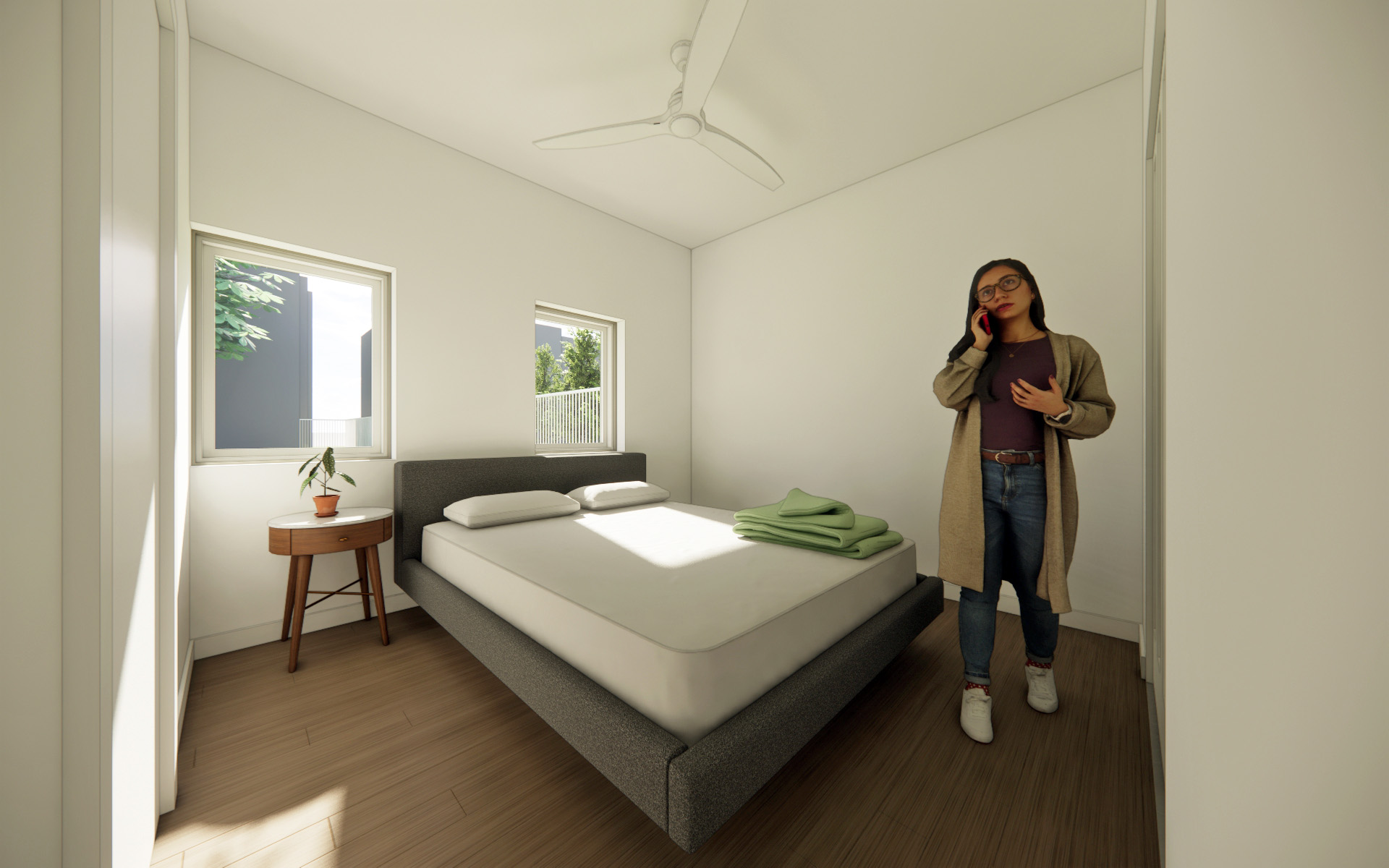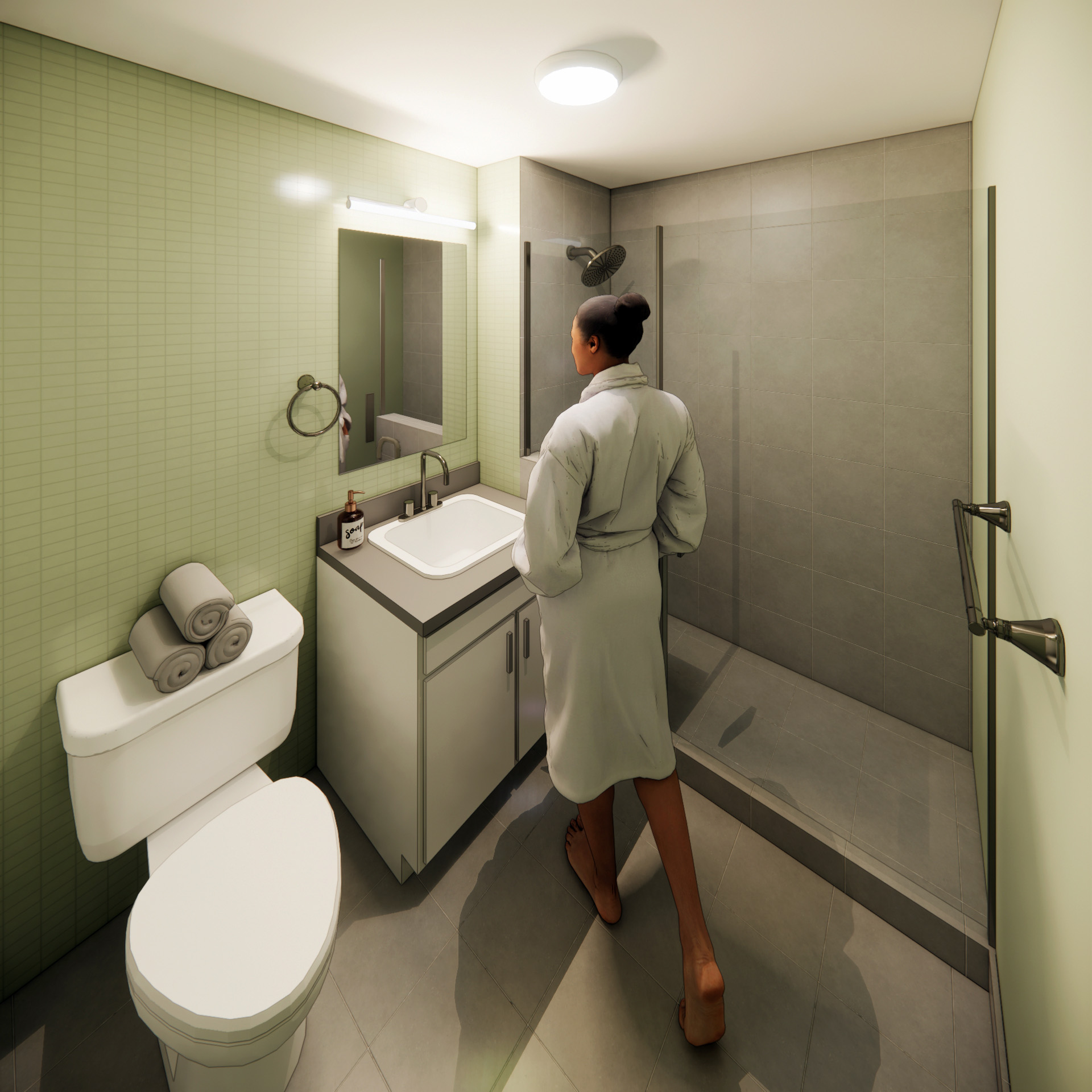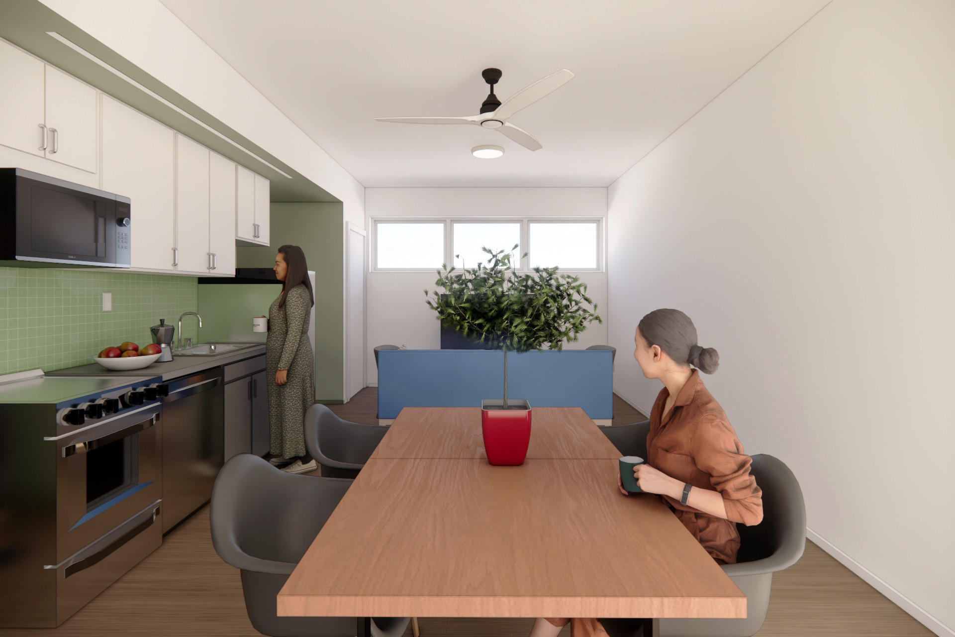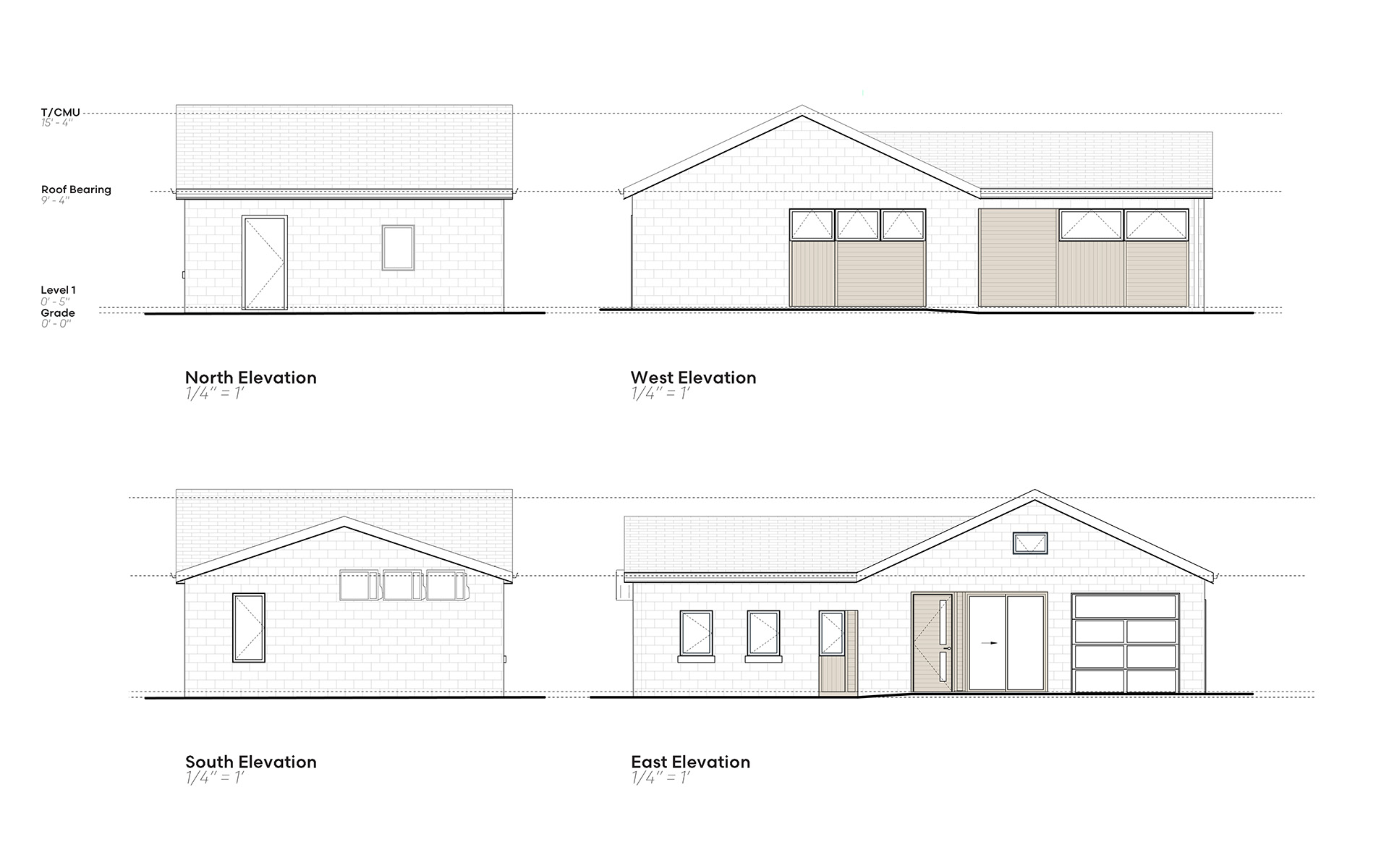 An existing garage gets a new life as a two-bedroom, one-and-a-half bathroom ADU Adaptive Reuse in Evanston, replacing parking with much-needed housing. Our client approached us with a desire to turn their existing garage, built by a past owner but not required for parking by the client, into new housing for family or potential rental. Utilizing the existing garage’s structure, we crafted a tripartite approach: creating an insulated box within the garage to house the ADU, opening new openings from the existing garage doors, and separating the program into bands. The Living/Dining/Kitchen area receives natural light from new openings at the former garage doors, serviced by a band containing storage, kitchen equipment, mechanical/utilities, and both the main bathroom and powder room. This service band separates living spaces from the bedrooms, allowing for privacy. Natural light and air fill the new ADU, reclaiming parking spaces for housing.